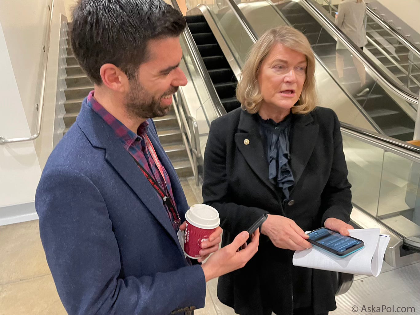 SCENE: Ask a Pol’s Matt Laslo gives Sen. Cynthia Lummis space as she chats with an aide. Once there’s a pause in the conversation, Laslo slides in and proceeds to hop an elevator with Lummis up to the Senate floor.